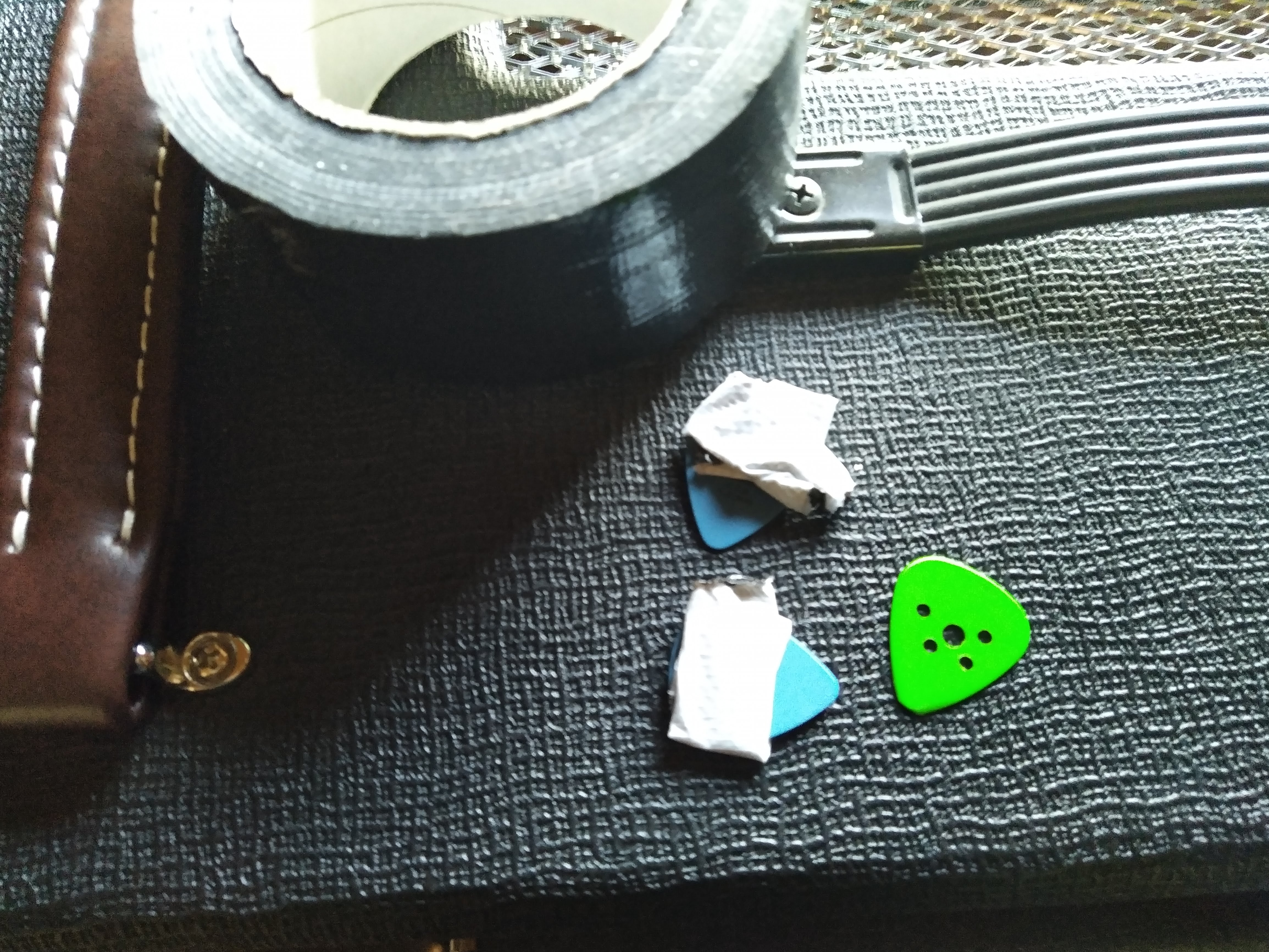 Yllättävä lisähaaste tuli myös allekirjoittaneen mistälie hermopinteestä. Ei haitannut kaiutinlaatikoiden kantamista mutta plektra ei pysynyt kädessä, pyöri vain sormien välissä. Ei auttanut plekuun poratut reiät. Roudarinteippi toimi aina aikansa, sitten rämmittiin sormilla ja napattiin uusi plektra. Eikä vinoilla siitä millä bassoa kuuluisi soittaa! Niin! Jollain tapaa keikasta kuitenkin selvittiin.