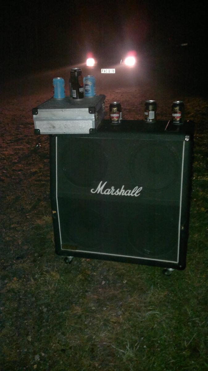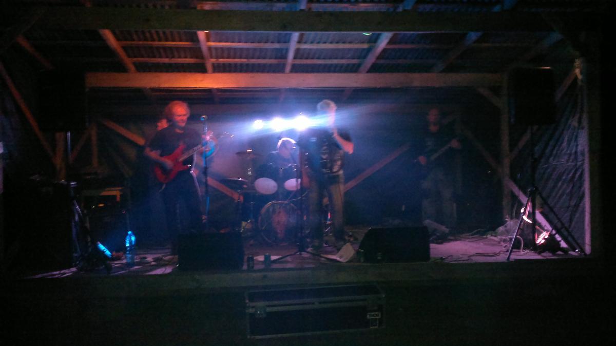 Perillä odottikin sitten ihan mukava yllätys, kunnollinen ulos rakennettu esiintymislava ja tarpeeksi valoja. Ja oikein savukonekin. Eli ei kuin kamat pystyyn ja hetki ihmettelyä että mitä tehdään basarimikin kierrolle. Subbari siis oli lavalla kun ei sitä oikein maahan lavan eteenkään voinut saderiskin takia laittaa. Ja rakenteita pitkin johtui iloinen 160Hz ujellus. No, saatiin se EQ:lla kuriin. Sadettakaan ei sitten lopulta tullut.